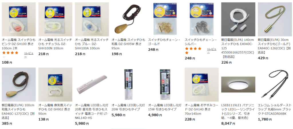 Amazonでは「スイッチひも」と検索することで、より多くの商品を検索できました。