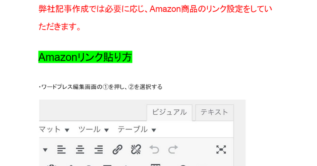 マニュアル 商品リンク貼り方弊社記事作成では必要に応じ、Amazon商品のリンク設定をしていただきます。 Amazonリンク貼り方 ・ワードプレス編集画面の①を押し、②を選択する ・そうすると下記のコードが本文に出力されます。 ・①にはAmazonの商品ページの下の方... - 画像の挿入方法がわからない方は、下記ページなどネット上にもやり方が書いてあるのでそちらをご参照ください。https://newstd.net/user_manual/media