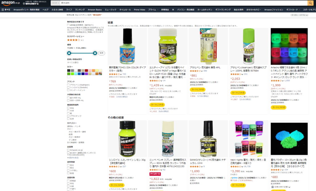 Amazonでは、蓄光塗料が様々な色・量で販売されています!