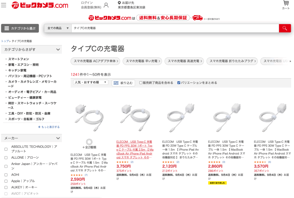 タイプCの充電器は、全国各地の家電量販店でも販売されています!