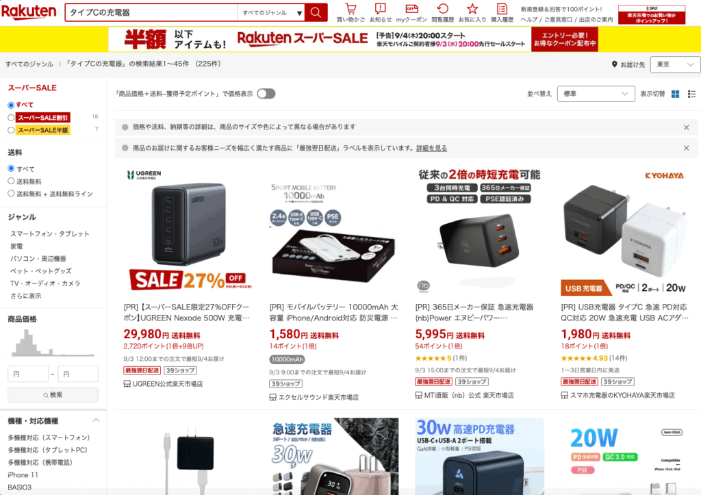 タイプCの充電器はAmazon、楽天では売っている?