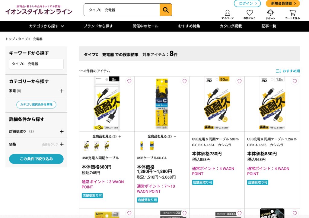 タイプCの充電器は、大型スーパーのイオンでも販売されていません。