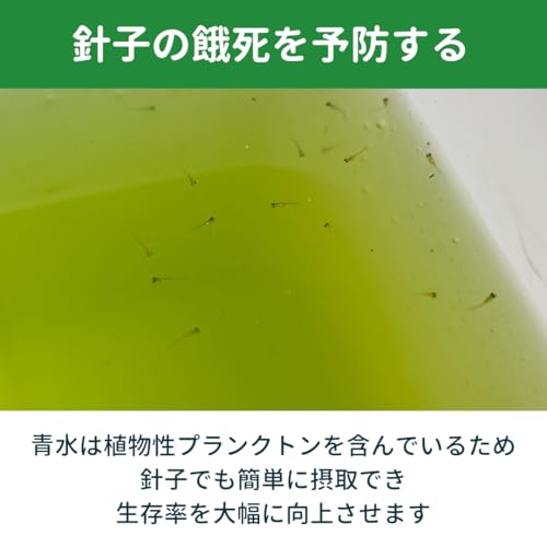 メダカ針子・稚魚用の生きた初期餌として最適で微細な植物性プランクトンが豊富で、食べ残しも少なく成長をサポートしてくれます。さらに水を汚しにくい天然餌で生存率アップ&水質安定し、餌の腐敗リスクが少なく、初心者でも安心して自然飼育することができます。