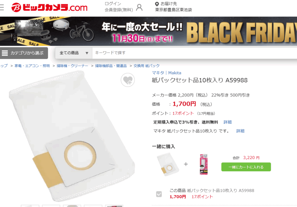 (公式ページ)ビッグカメラのマキタ掃除機の紙パック