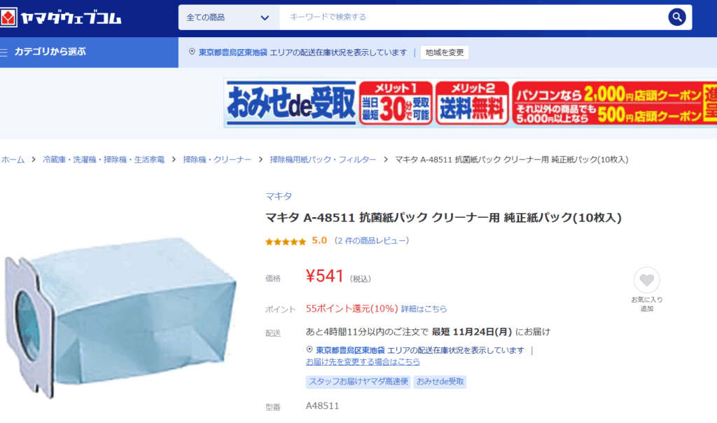 (公式ページ)ヤマダ電機のマキタ掃除機の紙パック