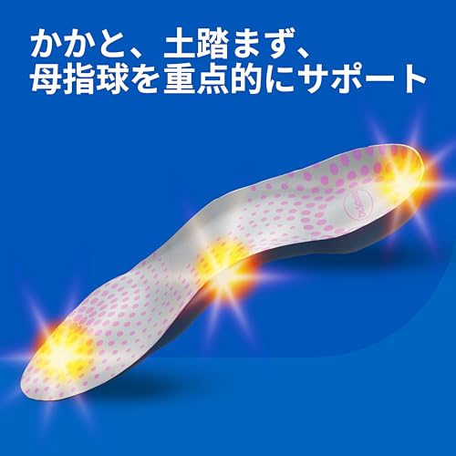 かかと、土踏まず、母指球といった足の重要な部分のサポートにより、歩行時の快適さを保ちます。使いやすくつま先を圧迫せず、優れたクッション性とサポート力で、あらゆる靴にバランス良くフィットします。
