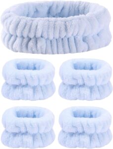 洗顔や家事で袖や床を濡らさない吸水リストバンド4点+ヘアバンド1点の5点セット。ふわふわ素材で大人も子どもも快適。吸水シュシュとしても使え、ギフトにもおすすめ。