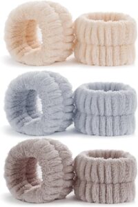 ふわふわのマイクロファイバー素材で素早く吸水するリストバンドの3組セット。洗顔時の袖濡れ防止や汗止め、お風呂上がりの吸水シュシュとしても使え、家事や運動時にも活躍。1年保証付き。