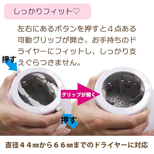 4点の可動グリップによるラウンドフィット構造で、円のカーブに沿ってぴったり密着し、ぐらつきません。直径44〜66mmのドライヤーに簡単に装着可能。熱と風を分散・拡散し、髪を傷めずにプロのようなふわふわヘアに仕上げます!