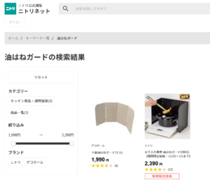 ニトリでも油跳ねガードの取り扱いがあるようです